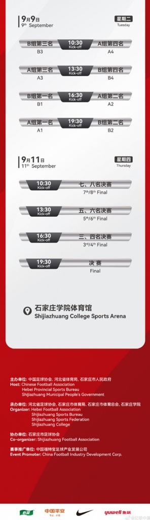 2025CFA中国之队·“北人集团”石家庄五人制足球国际邀请赛赛程公布!中国国家男子五人制足球队与柬埔寨男子五人制足球队、丹麦男子五人制足球队、印度尼西亚男子五人制足球队、韩国男子五人制足球队、缅甸男子五人制足球队、新西兰男子五人制足球队、阿联酋男子五人制足球队九月约战河北石家庄。