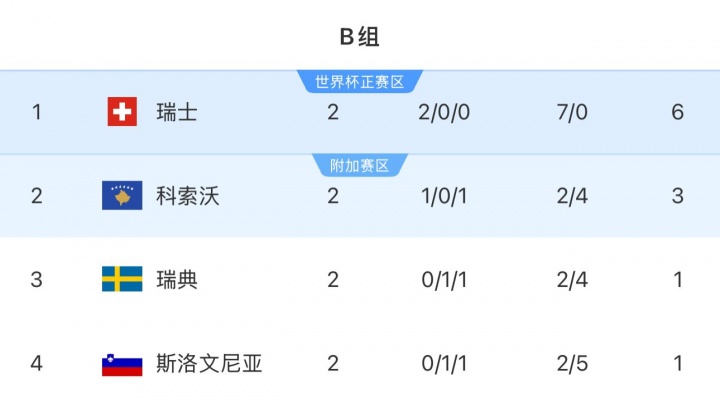 世欧预B组积分榜,瑞士2连胜领跑,科索沃3分第2,瑞典和斯洛文尼亚均2轮不胜积1分。