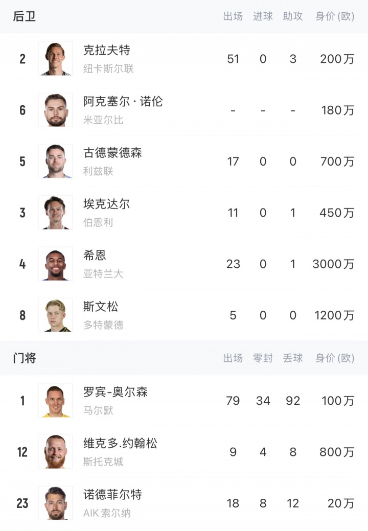 瑞典全队身价高达4.45亿欧,位列欧洲第10,阵中有身价1.2亿欧的伊萨克(利物浦)、7500万欧的约克雷斯(阿森纳)、4200万欧的伊兰加(纽卡)、4000万欧的雨果-拉尔森(法兰克福)、3800万欧的贝里瓦尔(热刺)和3000万欧的希恩(亚特兰大)。