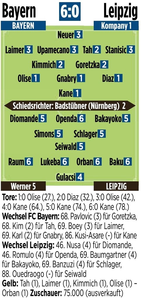 8月23日讯 德甲首轮比赛,拜仁主场6-0击败莱比锡,《图片报》对两队球员和教练进行了评分,凯恩、迪亚斯、格纳布里、奥利塞1分最高。