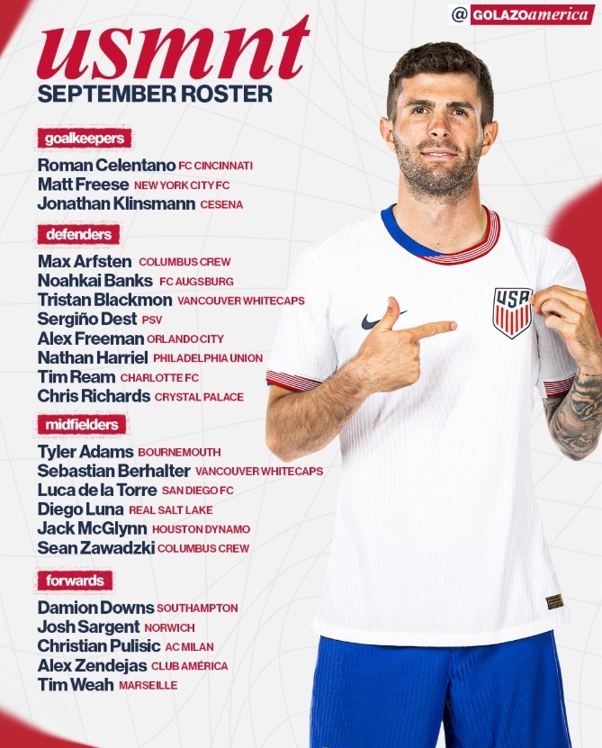 8月27日讯 即将到来的国际比赛日,美国将会和韩国及日本交手。目前,美国队已经公布了本期国家队大名单,普利西奇领衔,蒂莫西-维阿、德斯特入选。