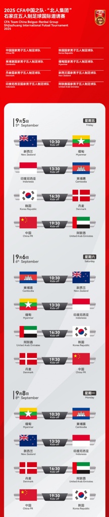 2025CFA中国之队·“北人集团”石家庄五人制足球国际邀请赛赛程公布!中国国家男子五人制足球队与柬埔寨男子五人制足球队、丹麦男子五人制足球队、印度尼西亚男子五人制足球队、韩国男子五人制足球队、缅甸男子五人制足球队、新西兰男子五人制足球队、阿联酋男子五人制足球队九月约战河北石家庄。