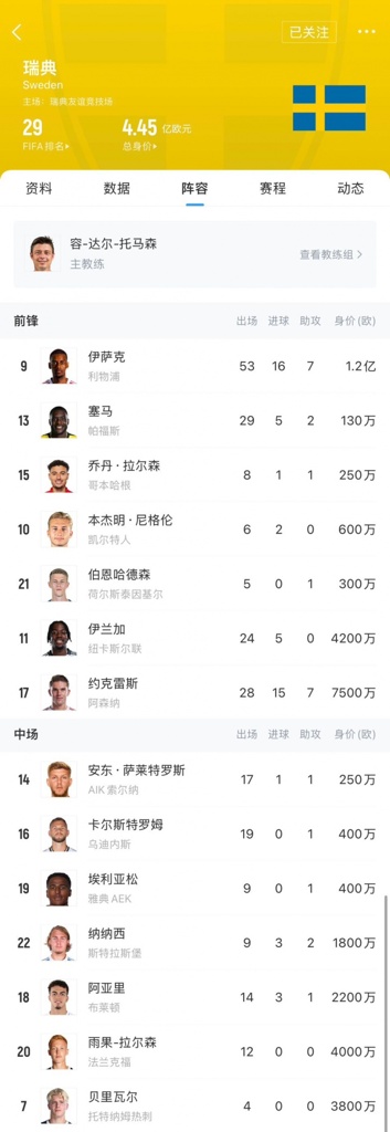 瑞典全队身价高达4.45亿欧,位列欧洲第10,阵中有身价1.2亿欧的伊萨克(利物浦)、7500万欧的约克雷斯(阿森纳)、4200万欧的伊兰加(纽卡)、4000万欧的雨果-拉尔森(法兰克福)、3800万欧的贝里瓦尔(热刺)和3000万欧的希恩(亚特兰大)。